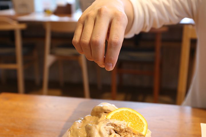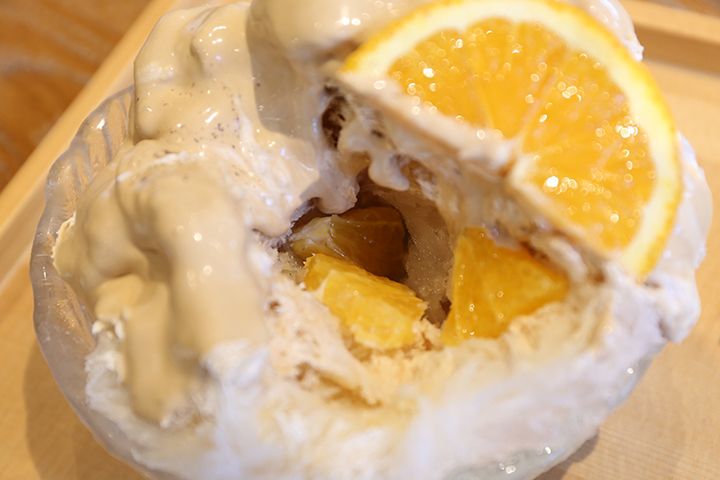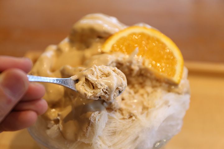 クリームの上にはオレンジが添えられていますが、こちらのオレンジ、実はかき氷の中にも忍ばせています。