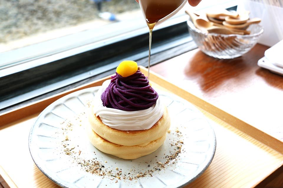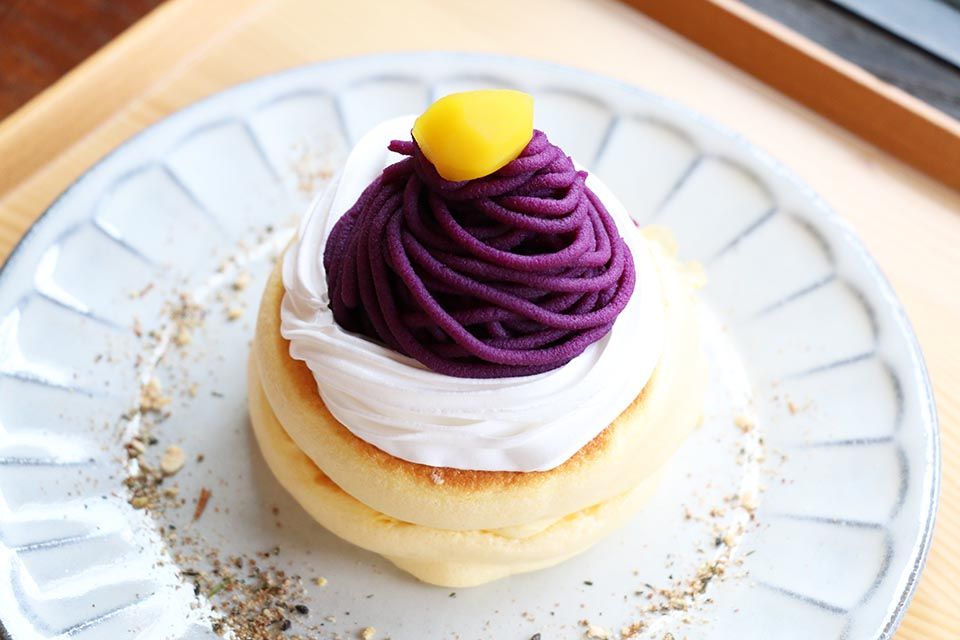 パンケーキの温かさとモンブランの冷たさがよく合い、まわりにトッピングされた七味を少しずつつけながら食べると味の変化を楽しめます。